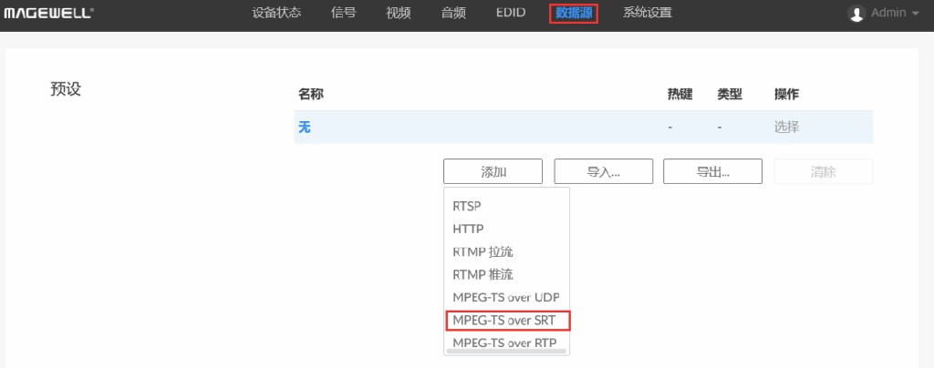 1、登录解码器Web GUI,点击进入“数据源”页签。点击“添加”,选择“MPEG-TS over SRT”。