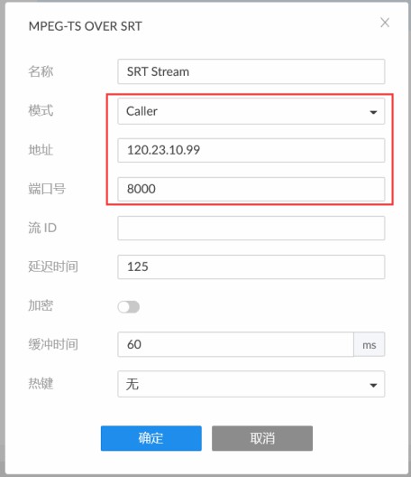 2、在弹出的页面,模式选择“Caller”,填写地址(该地址为编码盒IP地址)、端口号(与编码盒设置端口号一致),点击“确定”。