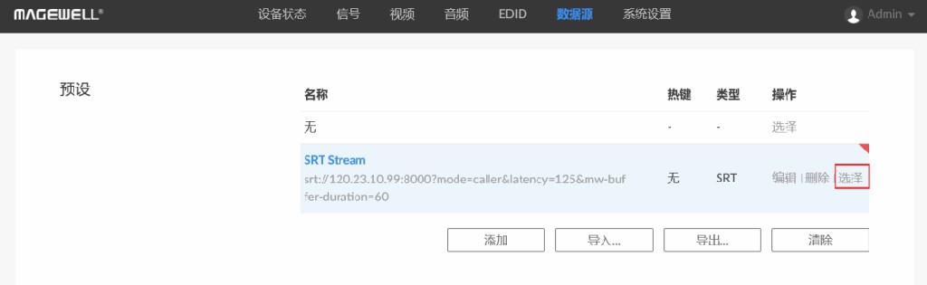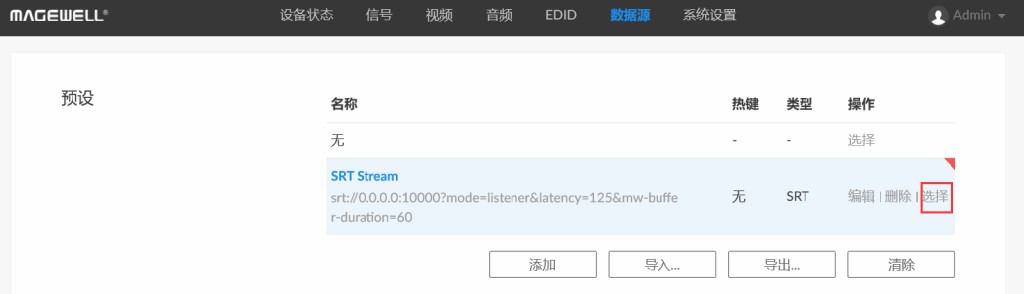 3、此时,会显示刚才所添加的预设选项,点击“选择”,即可解码来自编码盒发出的SRT流数据。