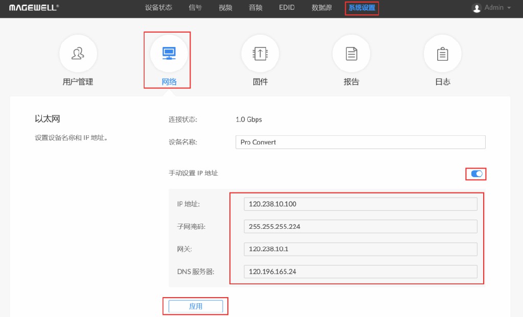1、登录解码器Web GUI,点击进入“系统设置-网络”页签,打开“手动设置IP地址”开关,填写IP地址、子网掩码等信息(IP地址需要为公网固定IP地址),点击“应用”。
