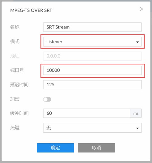 3、在弹出的页面中填写端口号(如图中8000),选择连接数(SRT Listener最多同时支持 8 个客户端),点击“保存”。