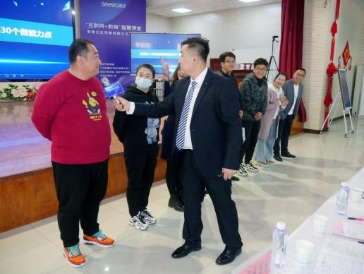 希沃宁夏区域售前顾问米建辉汇报了希沃年度最新产品,聚焦课堂书写的希沃交互智能平板高精度红外系列、突破传统广播局限的希沃区校一体化广播系统、让党群服务工作与新时代需求并行的希沃智慧党建解决方案、聚焦互联互通教室环境打造的希沃物联平台等,涵盖课堂互动应用、校园文化展示、教学形态创新等多个应用层面。