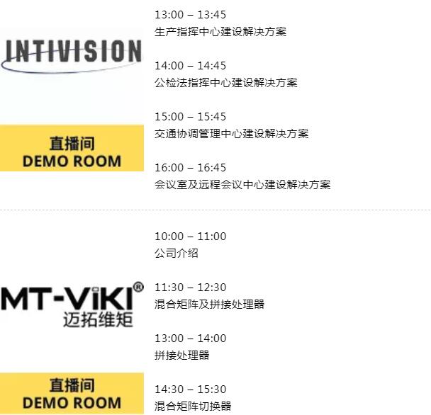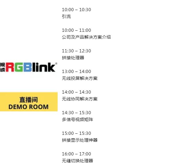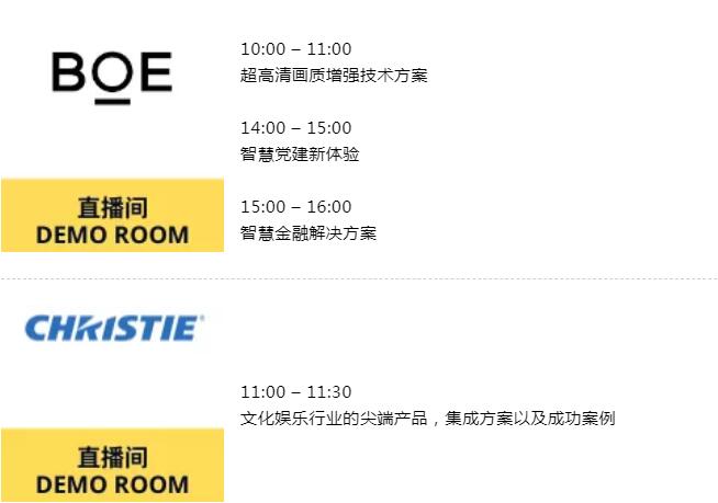 京东方、科视、影迪信息、迈拓维矩、视诚科技、ScreenBeam等展商即将进行即时直播,实时演示最新的视听技术及应用于 AV及IT渠道、广播/电信、娱乐/休闲、活动制作、博物馆、宗教、房地产/建筑、媒体/广告代理、零售行业的产品及解决方案,展商更会实时解答您的提问,加速促成业务合作!