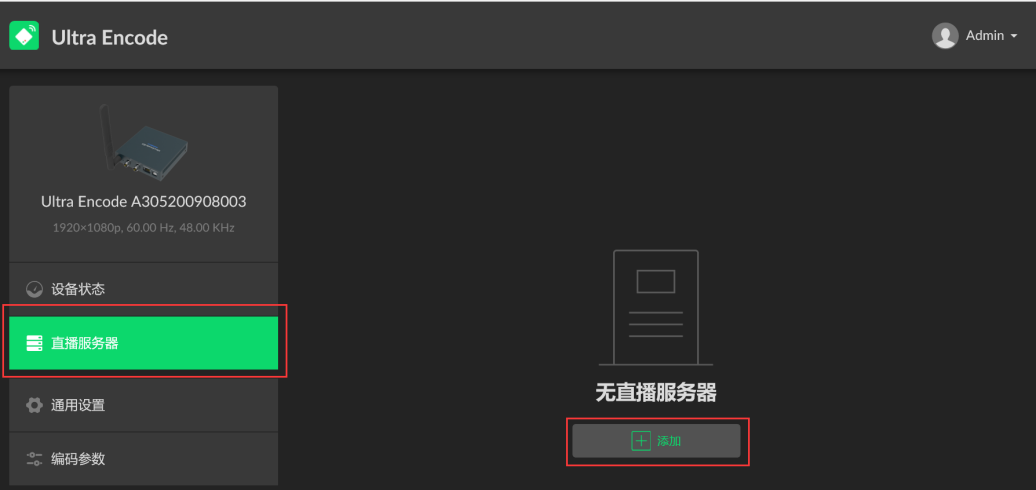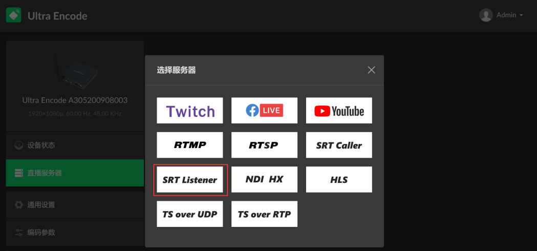 2. 进入“直播服务器”页签。点击“添加”,选择“SRT Listener”。
