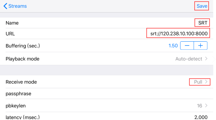 2. 进入设置界面,在“Name”栏填写SRT流名称,“URL”栏输入“srt://120.238.10.100:8000”,并在“Receive mode”栏中选择 “Pull”, 点击“Save”。
