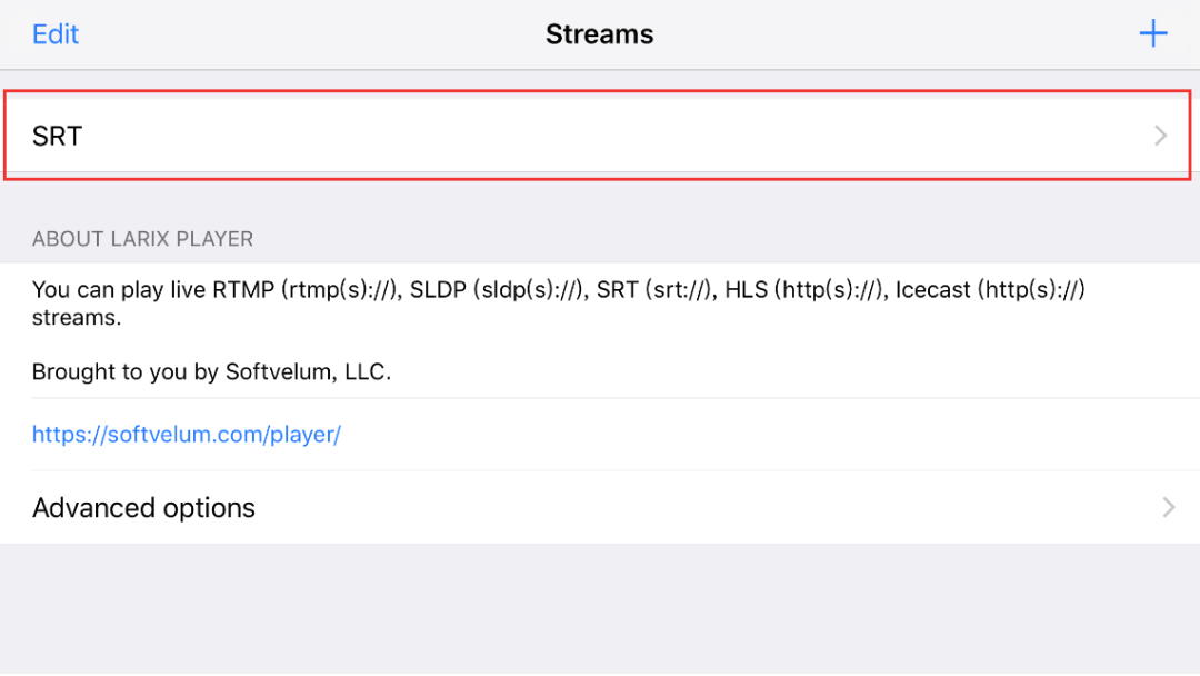 1. 打开Larix Player APP,点击右上角“+”按键。