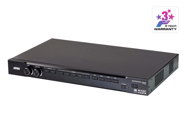 VP3520 5x2 True 4K Seamless 矩阵式演示切换器搭载控制功能,具备卓越视频质量,带来True 4K分辨率高达4096 x 2160@60 Hz(4:4:4)(HDMI)/4096 x 2160@60 Hz(4:2:0)(HDBaseT)。同时具有4K升频器功能,可将输入分辨率转换为最佳显示分辨率。可自动显示开/关控制,通过CEC、IR、RS-232、PJLink来控制显示器,并通过继电器控制投影仪屏幕。内置2 x 10 W功率放大器,接线端子连接器上还带有扬声器输出,整体设计将易用性大大提升。