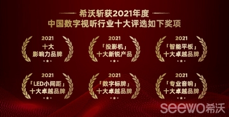 2022年1月6日,中国数字视听行业十大评选隆重揭晓,希沃再次斩获6项大奖,时隔一年,希沃又一次受到了行业的高度认可: