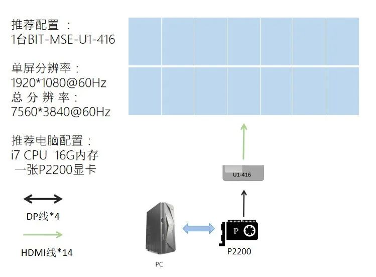 项目方案:通过使用P2200显卡+BIT-MSE-U1-416设备+输出屏幕,即可完成整屏高清输出效果,再搭配外接红外边框进行点触位置矫正,搭配特定互动片源以达到整个项目的完美呈现。