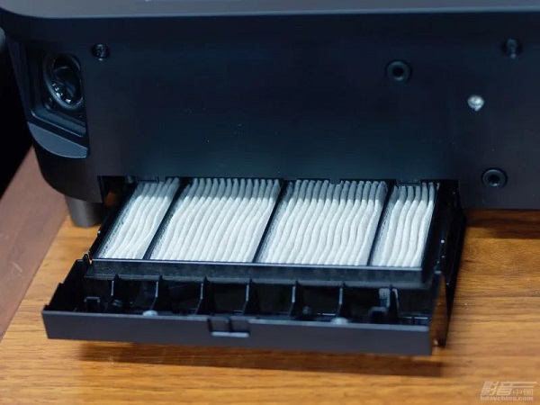 只需掀开正面的防尘网罩,我们就可以清晰地看到爱普生EH-LS800B所搭载的雅马哈深度定制2.1声道内置音响系统,包括位于左右两个角落、专门优化发声角度的主声道喇叭单元,采用FR-Port前置倒相孔结构的低音喇叭单元。在雅马哈定制DSP音频解码芯片与多种预设音效模式的支援下,爱普生EH-LS800B可以让用户根据各种不同的观看内容获得声场与细节层次俱佳的听感享受。