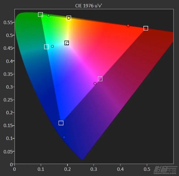 影院模式,4K HDR测试信号下,色域覆盖范围超过80% DCI-P3,白点接近于D65