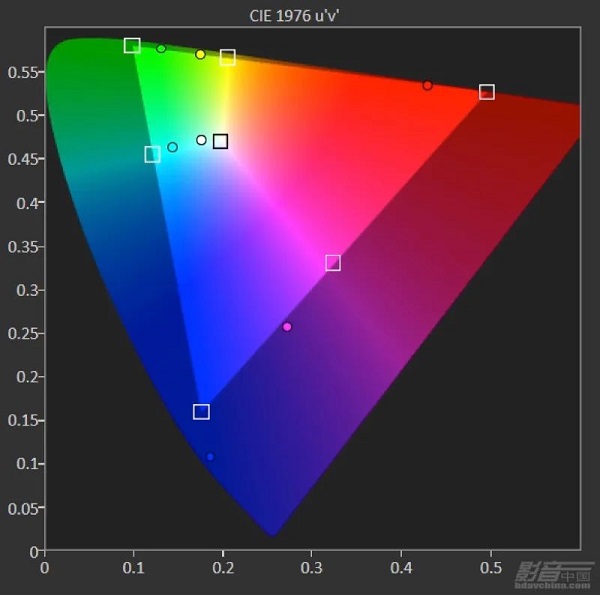 影院模式在HDR ColorChecker色准分析中,平均误差值deltaE 2000仅为2.15,在人眼可判别的误差范围内