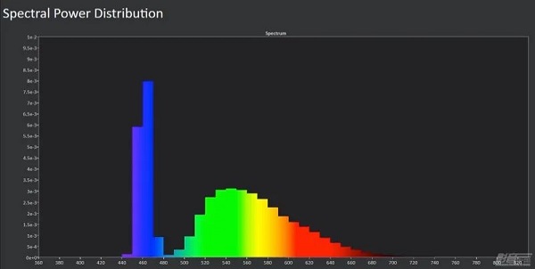 为了更深入地掌握EH-LS800B机身内部激光光源的技术特点,我们通过Portrait Displays Calman专业色彩测量软件与分光计,对激光光源进行了深入的光谱能量分布测试。从测试结果,我们发现EH-LS800B在蓝光部分拥有最高的能量,基本上是绿色与红色能量的两倍或以上,峰值部分集中在460-470nm,避开了对人眼可能造成危害的430nm波长段。另外,绿色和红色部分没有形成集中的高能量分布。从上述的光谱能量分布特点,我们基本可以判定爱普生EH-LS800B采用的是成熟的蓝光激光光源技术,期待爱普生下一代机型可以采用多色激光光源技术,以获得色域方面的进一步突破。