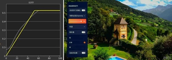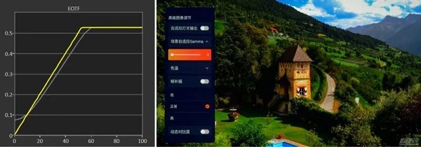 在EH-LS800B之中,我们发现了专门针对HDR影像优化的场景自适应Gamma功能,可以根据画面不同场景的亮度变化自动调整Gamma(EOTF)曲线,适当的开启可以有效提亮画面暗部亮度,增加暗部的细节层次。