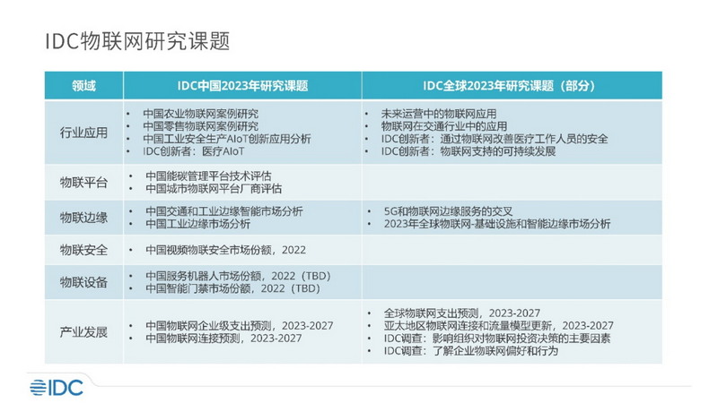 2023年IDC持续跟进物联网的研究,围绕重点行业应用、物联平台、物联边缘、物联安全及物联感知新设备技术开展,具体研究课题如下: