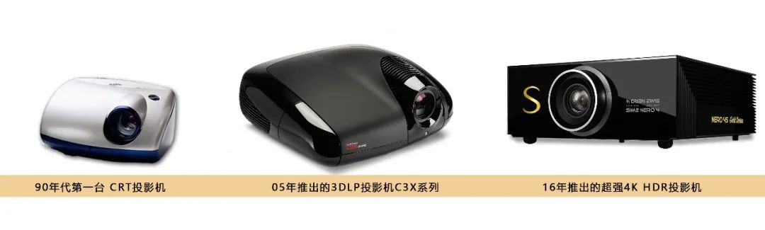 在数以百计的产品中让我们一起来追溯下几个代表性的产品:首先是 90年代第一台 CRT投影机,传奇的HT200 (2000年第一台专为家建影院设计的投影机)、标志性的 C3X系列(2005年,前所未有的超强性能 3片式 DLP投影机),NER04系列(2016年,市场上第一款 DLP 4k UHD投影机),CRYSTAL4 sh (2021年,4KUHD复合激光光源投影机)。