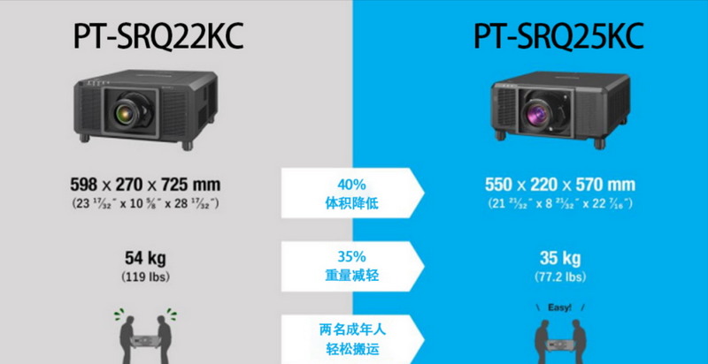 松下PT-SRQ25KC系列工程投影机机身仅重35KG,两名成年人即可轻松搬起。该系列工程投影机比同为20,000流明的3DLP 4K工程投影机体积降低40%,重量减轻35%,为各类场景下的安装使用,降低储存及搬运成本,节省安装耗材辅料,增加生产效率,带给您前所未有的使用体验。