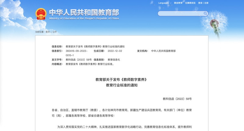 2022.12.09教育部发布《教师数字素养》教育行业标准,以扎实推进国家教育数字化战略行动,完善教育信息化标准体系,提升教师利用数字技术优化、创新和变革教育教学活动的意识、能力和责任。