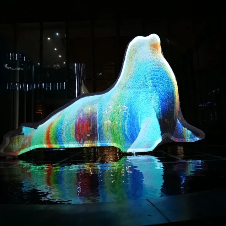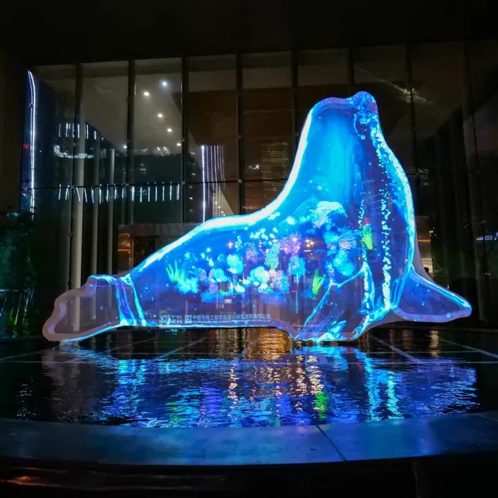 中恒设计集团大楼的正门处,《水上精灵》作品格外引人目光,一只海豹在水池上支撑起前鳍,影像在外罩的网纱上成像,漂浮游走,凝聚离散,赋予装置动态的美感。