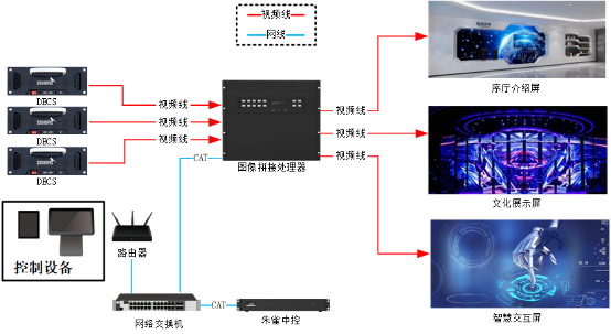 视频传输处理系统包括LED显示屏及图像拼接处理器,系统拓扑图如下: