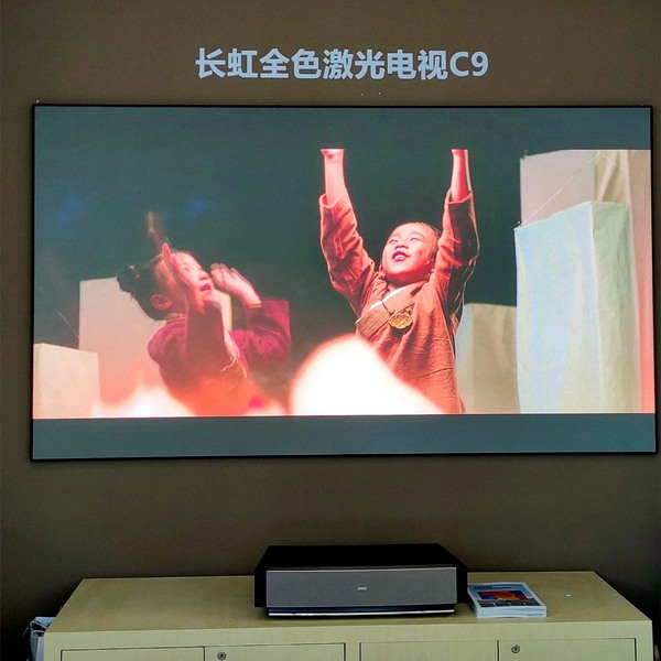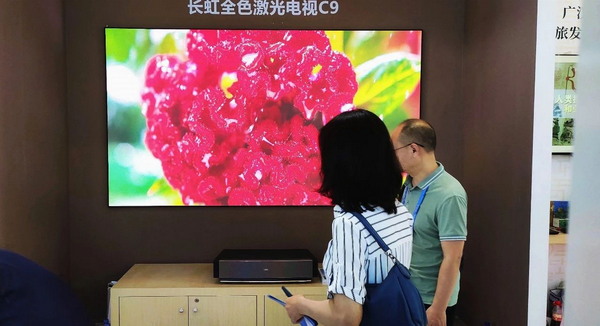 以此次展出的长虹激光电视C9为例,它搭载长虹自研STLD4.0全色激光显示技术、AI原色引擎技术等,进一步提升光机能效和整机亮度,提供120吋甚至更大尺寸的4K超高清画质。