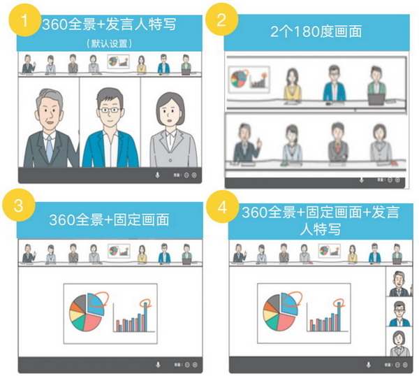 会议过程中,用户还可通过RICOH Meeting 360 Apps for Windows® APP设置图像呈现方式,四种画面布局随心切换,满足各种会议类型,适配不同应用场景。例如在常规会议中可以选择360°全景画面+发言人特写,在演讲场景中则可设置为360全景+固定画面+发言人特写的模式,并对指定画面例如演示白板等进行放大和特写,一边演示一边讨论。