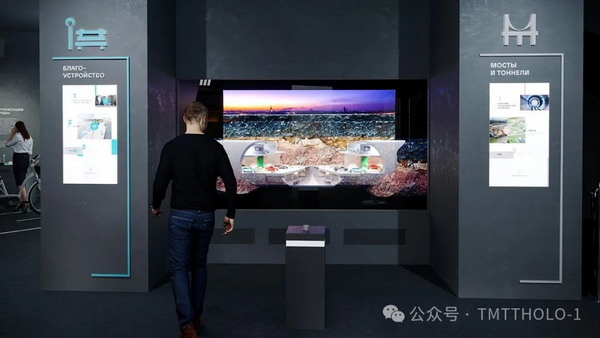 参观者通过全息沙盘装置前方的旋钮装置,选择任意城市著名的工程结构(桥梁、隧道、立交桥),具有裸眼3D效果的模型可720°旋转,且配有3D动画视频,解释其配置以及有关其建造过程和建造历史的有趣细节。