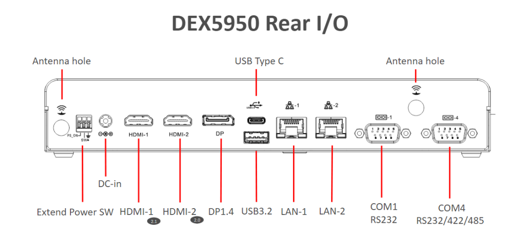丰富接口,可适用多种应用需求:HDMI*2、多网口、USB3.2*2、USB2.0*2、Type C w/DP*1、DB9 RS232*1、DB9 RS232/422/485*1