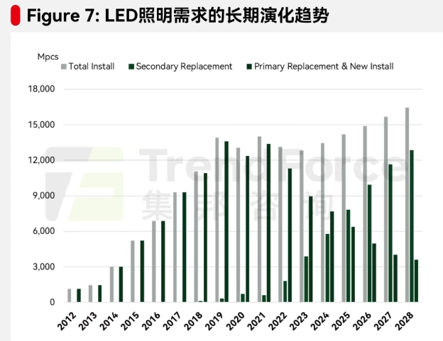 任何产业都有其生命周期。根据TrendForce分析,通用照明市场正处于从成长期后端向成熟期过渡的关键阶段。数据显示,市场增长的主要驱动力已从新增需求(Primary Replacement & New Install)转向存量替换需求(Secondary Replacement),整体市场规模增速显著放缓。这意味着市场的爆发式增长期已经结束,行业进入了产能出清和存量博弈的阶段。