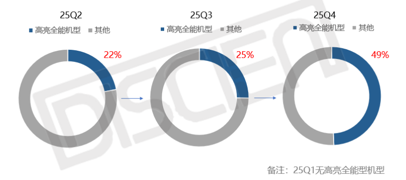 从市场表现来看,“高亮全能”产品呈现出与此前4K产品方向不同的销售表现。2025年,此类机型零售价格主要位于1500-1800元,在刚刚推出的25Q2,其销量在1500元以上1LCD产品中的销量占比为22%。至25Q4多品牌跟进推出该类型产品,其市场销售份额大幅提升49%。
