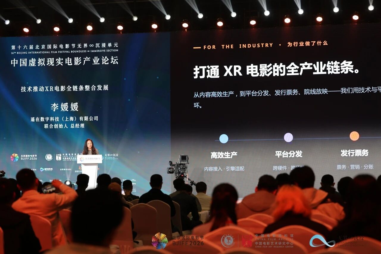 截至目前,遥在XR院线平台已累计覆盖200余个服务场所,累计服务内容过百个。遥在数字科技(上海)有限公司联合创始人、总经理李媛媛分享了在虚拟现实领域近4年的探索经验,并介绍了即将推出的多项行业扶植计划。其中,贯穿生产到发行的AI+计划拥有6项AI核心能力且可规模化复制;坐观式增强计划可显著提升观众体验;XR影院流量扶持计划聚焦提升线下门店流量;XR媒介变现计划则挖掘XR电影广告价值,实现变现回流。李媛媛表示,内容的繁荣才能推动平台的繁荣,平台的繁荣才能推动行业的高质量发展,“我们希望和所有同行者一起努力,推动XR电影行业的发展”。