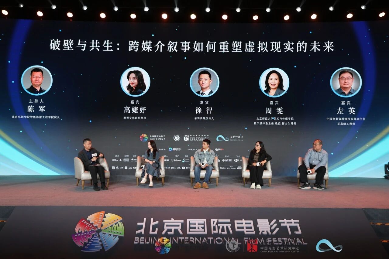 跨媒介叙事是此次论坛的焦点之一,君看文化副总经理高婕妤、亲客传媒创始人徐智、北京师范大学艺术与传媒学院数字媒体系主任周雯、中国电影资料馆技术部副主任左英等就XR技术与电影关系、IP改编、跨媒体挑战机遇、教学新举措及经典电影修复等进行了分享。北京电影学院智能影像工程学院院长陈军主持对谈。