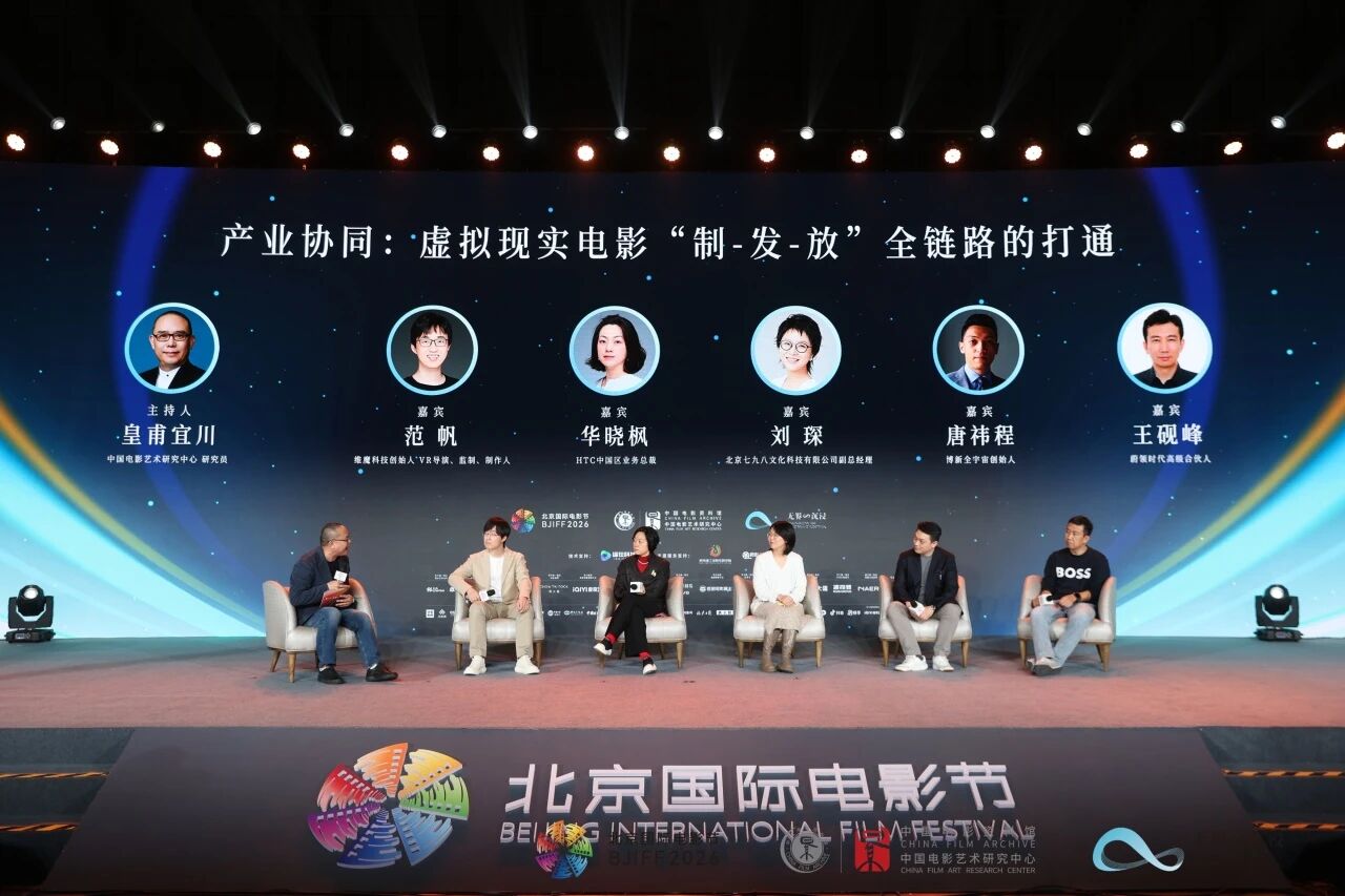 “制—发—放”全链路的产业协同也在论坛上得到了重点关注。维魔科技创始人、VR 导演范帆,HTC中国区业务总裁华晓枫,北京七九八文化科技有限公司副总经理刘琛,博新全宇宙创始人唐祎程,蔚领时代高级合伙人王砚峰等聚焦VR电影产业在制作、宣发、标准等方面的发展现状进行讨论。中国电影艺术研究中心(中国电影资料馆)研究员皇甫宜川主持对谈。