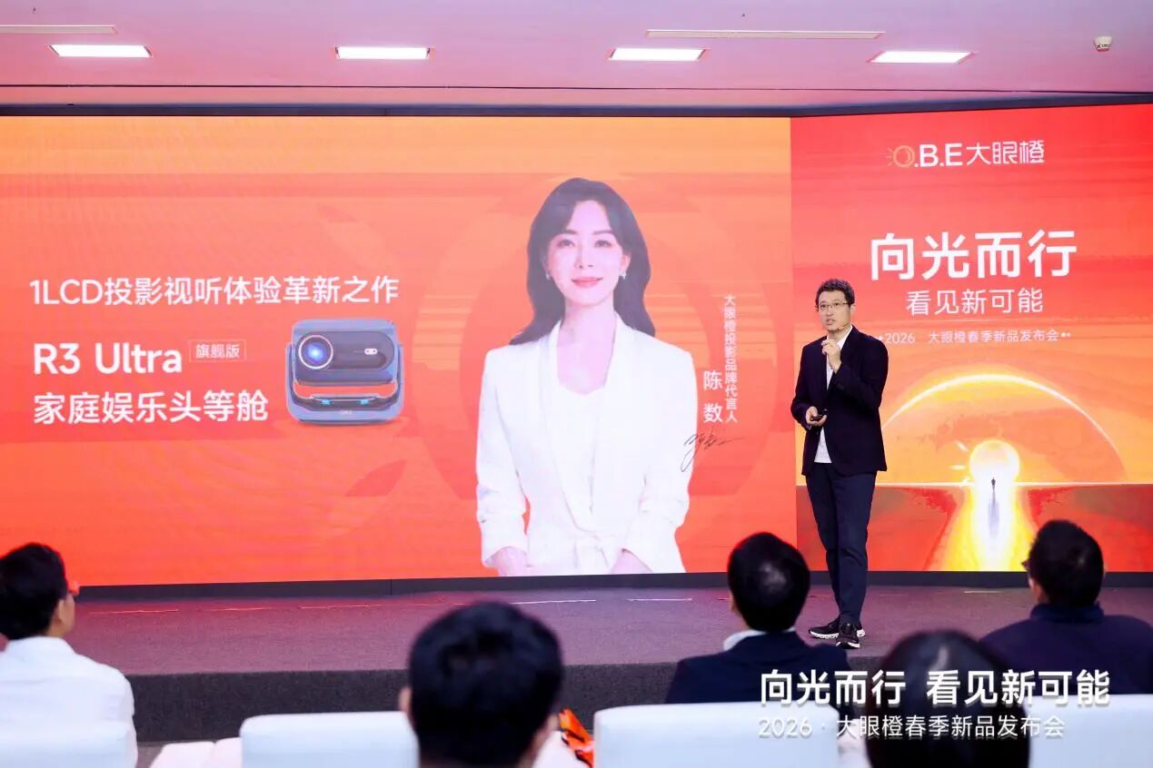 4月16日,国内智能投影行业头部品牌大眼橙于深圳盛大举办2026春季新品发布会。本次发布会以“向光而行 看见新可能”为核心主题,重磅推出R3 Ultra系列、C3 Max两款核心投影新品,并跨界首发首款AI智能眼镜,完成从家用投影到全场景智能显示的战略拓展。现场同步官宣品牌九周年代言人陈数,以品牌升级之势,携手传递“给你美好生活每一天”的核心愿景。