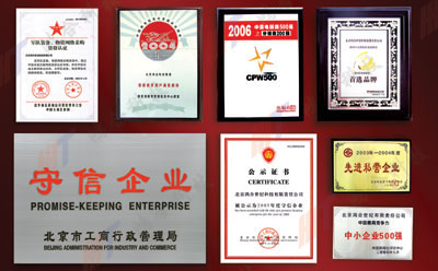 (军队装备、物资网络采购资格认证证书,2004年度教育部“教育用户满意度奖”,2006年CPW500分销商200强,2006年度教育行业投影机渠道供应首选品牌,北京市工商行政管理局守信企业,北京市私营个体经济协会先进私营企业,中国新闻社“中国最具竞争力00强”)