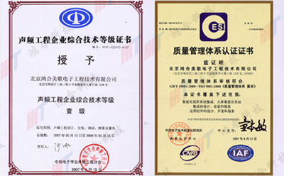 声频工程企业综合技术等级一级证书 ISO9001质量管理体系认证证书