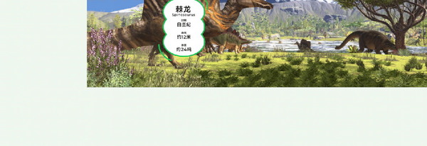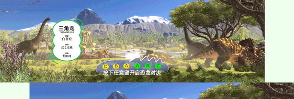 待机场景中展现了恐龙的生活环境。每间隔一定时间,不同种类的恐龙会以走T台的形式在画面前路过,并会弹窗出现该恐龙的相关信息介绍。