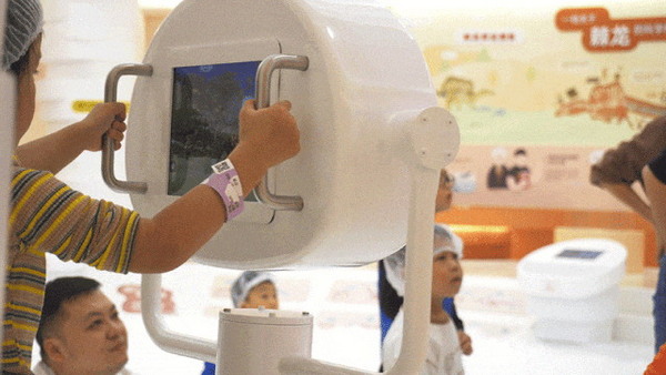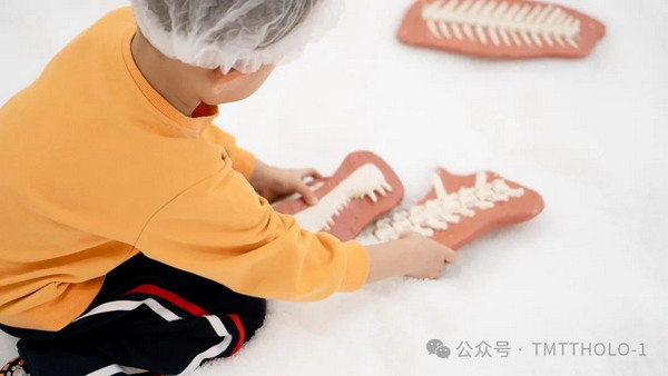 空间中面积较为大的部分为“恐龙挖掘区”,小朋友穿戴好防护装备进入沙池自由探索、挖掘事先埋下的恐龙化石模型。在老师的指引下,将挖掘出的恐龙蛋、骨化石等模型放在化石扫描台识别。