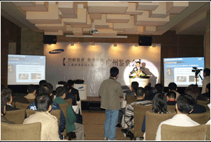 下午14点,在主持人宣布此次鉴赏会开始的掌声中,"三星高清家庭影院投影机广州鉴赏会" 正式开始。 首先由三星中国投资有限公司显示器营销部产品总监李刚致辞,他给现场观众分析了三星选择这个时机进军中国投影市场的背景,他认为,随着Blu-ray、HDDVD、HDTV等一系列高清影像设备发展日新,高清影像离中国的家庭消费者也越来越近,作为未来家庭超大屏幕(80英寸以上)显示终端最理想的成像设备,高清级家用投影机自然日益受到关注,近年来,各传统投影机厂商均在家用机型方面积极投入,动作频频,新机层出不穷,不过真正有强大影响力的新晋厂商并不多见,在此背景下,三星电子借多年来在IT、数码、通讯、半导体及家电领域所沉淀下来的技术及资金优势,选择在这个时机进军中国投影机市场,无疑是在一个最恰当的时机做出的最明智的举措!李总还向与会者展望了三星在中国未来发展的前景,他认为,随着新科技在提升人类生活品位方面的贡献日益凸现,娱乐和享受型消费亦随之成为全球个人消费新热点,其中,以高清晰大画面影像和专业环绕音响为主要部分组成的高清家庭影院,自然首当其冲受到越来越多家庭用户的追捧,而作为最重要的高清家庭影院核心设备--高清家用投影机(包括标清720p和全高清1080p),也将倍受消费者的青睐,可以预见,三星投影机在中国投影市场的发展将是令人期待的!