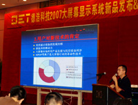 作为技术盛宴,会议精华部分当属孙安君经理对德浩公司及MPDP在大屏幕市场的介绍。在本次发布会上,欧丽安MPDP4220崭新型号依然是最大亮点,2mm以下的拼接缝隙,10000:1的对比度,1000cd/m2使得整个屏幕更加明亮,画面衔接更加流畅自然。据悉,德浩公司2003年9月引进全球首创最大--韩国ORION84寸无缝拼接等离子显示器,在2006年销售超过1.6亿。目前,中国大屏幕市场逞高速增长之势,而MPDP的增长速度最为惊人,达到300%。MPDP等离子是大屏幕行业的革命性技术,2007年在气象和港务两个领域增长速度最为突出,分别为300%和330%。加上用户对新技术的肯定、用户对大屏幕显示品质的更高要求、大屏幕平板化数字化的趋势、MPDP本身的技术优势以及MPDP新产品的陆续推出,形势非常良好,发展前景一片光明。 |