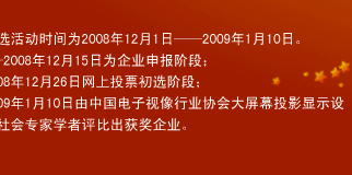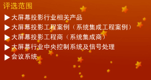 | 首页|活动简介|网上投票|奖杯奖状| 往届评选[2006][2007] | 主办单位:中国投影网、中国电子视像行业协会大屏幕投影显示设备分会 |
