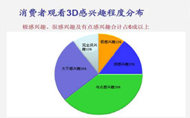 消费者对3D的兴趣程度,也能使我们对未来3D产业的发展保持乐观。调查显示,消费者对观看3D极感兴趣、很感兴趣及有点感兴趣的合计超过六成。