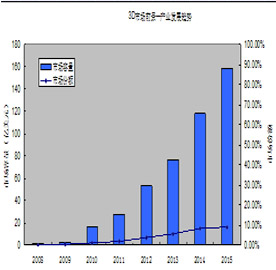 据调研机构DisplaySearch最新显示器市场与技术分析报告显示,预计2018年立体3D显示器市场将由2009年的70万台增长到1.96亿台,产值将达到220亿美元,出货量年符合增长率高达75%,而产业值的年复合增长率为38%。