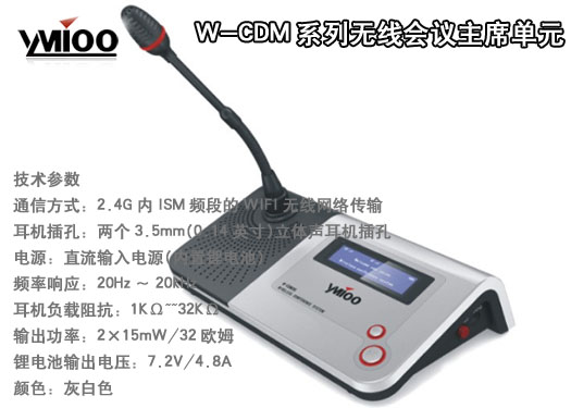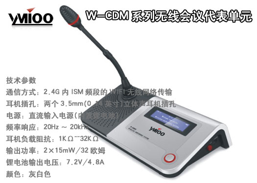 WIFI无线会议单元W-CDM7B/W-CDM7CYMIOO(优麦)W-CDM7B数字无线WIFI主席单元和W-CDM7C数字无线WIFI代表单元是极具一款高档的会议单元,单元和主机收发之间采用最新的2.4G的ISM频段的WIFI无线网络为传输调制技术,IEEE802.11g的标准,128位通信加密技术,无需担忧会议的泄露,单元采用耐用直流(12V/3A)可充电的内置锂电池工作,可持续工作8小时,同时支持边充电边使用。[ 产品信息 ] 产品应用场合: W-CDM系列无线YM-WIF100收发器YMIOO(优麦)无线WIFI收发器专用于YMIOO无线WIFI会议主控机和无线WIFI会议单元之间的信号收发使用,一般确保通信稳定可靠可装置在会议室中,在以太网内传输。[ 产品信息 ] 功能描述 1、 灵活、稳定的WAP支持任意一款的触摸屏作用于一个广阔的覆盖范围和区域e W-CDM系列无线会议主机Ymioo(优麦)运用多年无线开发研究的基础上,基于2.4GISM频段的WIFI无线网络传输技术相结合的嵌入式数字处理高新技术;对无线一次次又一次的推向现代高端会议的历史舞台,该款无线会议主机采用全数字处理,采用双向全双工传输技术,真正做到话筒与话筒之间,话筒与主机之间无缝隙的通信,内置高功率发射器,只需配置数据控制流既可以实现整个会场的信息传输,而且每支话筒内置高性能高存储量的锂电池,可以保证每支话筒可连续使用8~12小时的工作量,是国内首家采用话筒与话筒之间、话筒与主机采用全双工传输,传输信号根据准确无误的ID的基础上传输,所以信息通过WIFI渠道传输保密又可靠,是当之无愧的当今高级无线会议的“佼佼者”。 [ 产品信息 ] W-CDM系列无线会议主席单元YMIOO(优麦)W-CDM3B数字无线WIFI主席单元和W-CDM3C数字无线WIFI代表单元是极具一款高档的会议单元,单元和主机收发之间采用最新的2.4G的ISM频段的WIFI无线网络为传输调制技术,IEEE802.11g的标准,128位通信加密技术,无需担忧会议的泄露,单元采用耐用直流(12V/3A)可充电的内置锂电池工作,可持续工作8小时,同时支持边充电边使用。[ 产品信息 ] 产品应用场合: W-CDM系列无线会议代表单元YMIOO(优麦)W-CDM3B数字无线WIFI主席单元和W-CDM3C数字无线WIFI代表单元是极具一款高档的会议单元,单元和主机收发之间采用最新的2.4G的ISM频段的WIFI无线网络为传输调制技术,IEEE802.11g的标准,128位通信加密技术,无需担忧会议的泄露,单元采用耐用直流(12V/3A)可充电的内置锂电池工作,可持续工作8小时,同时支持边充电边使用。[ 产品信息 ] 产品应用场合: 简约型无线会议-CM6180/CM6180T本机装置容易,功能强大,特性稳定,能在复杂的高级会议环境下,获得最满意的效果。[ 产品信息 ] 功 能 特 点 |