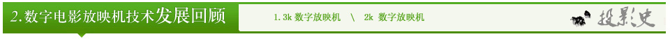 | 初期的1.3k数字电影放映机很像传统的胶片放映机,是数字放映从无到有的第一个体积庞大、但非常神奇的机器,它可以不用传统电影胶片就可以放出影像色彩接近电影胶片放映质量的影像,使业界同仁大开眼界。 | |||||||||||||||