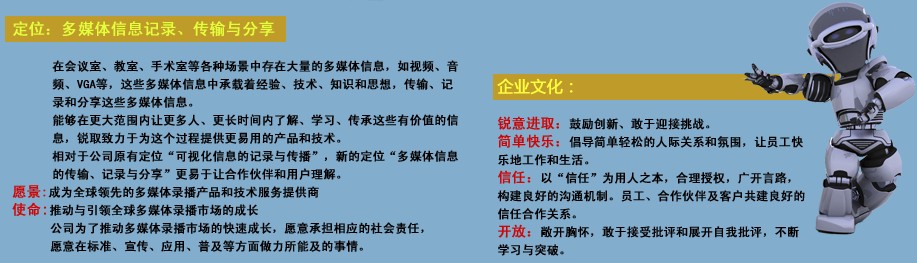 2013年,锐取将推出以记录/传输/分享等系列新产品,这是锐取人在行业历经10后的又一次启程,在这10年中,锐取形成对教育、会议室、医疗行业的录播应用有了更为深入的理解和技术探索,我们必将为用户提供更加完善的应用...>>详细