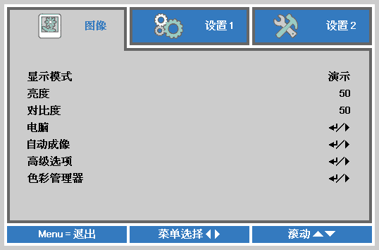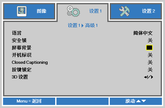 | 如果连接了多个输入设备,按信号源按钮和使用▲▼在设备之间进行滚动。 | 丽讯Vivitek菜单一向以简易、适用为基本原则。作为家用/商教多用途的MW1301F来说,菜单设置要求更要简易、实用,贴合用户实际应用需求。 | 按菜单按钮打开 OSD 菜单。 按 ??移到设置 1 菜单。 按 ▲▼移到高级 1 菜单,然后按 Enter 或 ?。 按 ▲▼ 在高级 1 菜单中向下移动至“3D设置”。 |