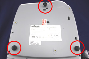 Vivitek(丽讯)DX864投影机在机身底部设置有三枚可调节支架,前端一枚后端两枚,大大方便了投影画面高度的调节,调节范围约在4厘米左右,让投影机在有限空间内有更大的操作余地。 |