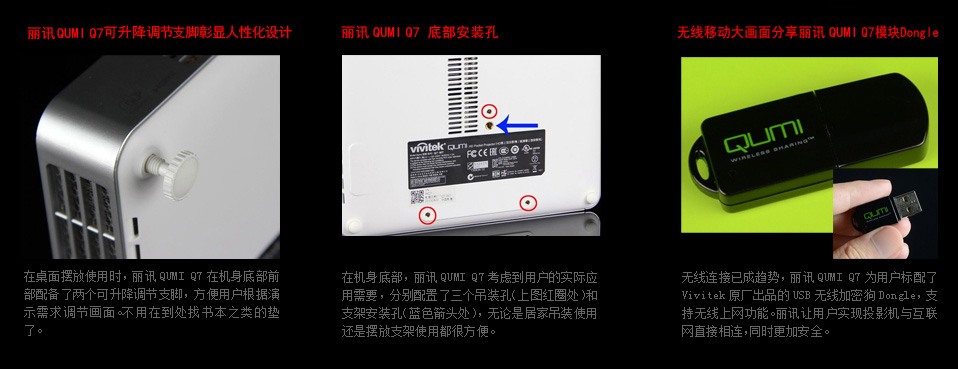 目前来说,QUMI Q7是微型投影机中的佼佼者。其不论在处理人物面部细节、整体风景以及动作场景等方面都表现的非常出色,同时,该机强大的移动便携性,让你随时随地体验私人影院。 此外,丽讯为QUMI Q7应用了高成本特殊镜头,让其成为了业界首款采用2.35:1格式的LED微型投影机引领行业技术,可以毫无损害的将大片完美播放出来。更为值得一提的是,丽讯QUMI Q7采用了DLP© Link™ 技术,兼容全部3D格式, 而最新蓝光3D效果更是让用户在家中轻松体验到更为立体、鲜艳、清晰的3D画面。 |