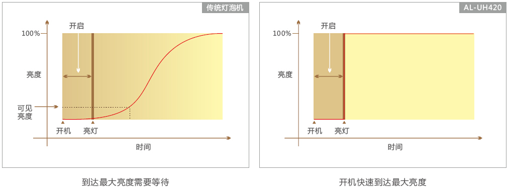 | AL-UH420 提供即时开/关机功能。开机瞬间即达到全数亮度,并且无须冷却即可瞬间关机。面对突发的停电,断电,人为操作失误等,